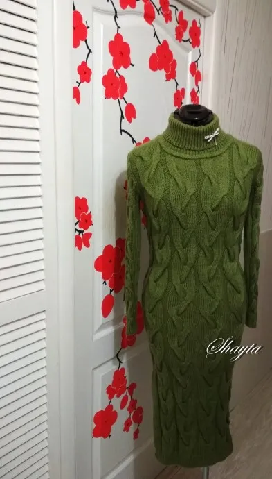 Здравствуйте, мастерицы! Платье «Айви» от Shayta, простое- с косами, с воротником-гольф, связано на заказ, на размер 44-46.Авторским назвать не могу, наверняка уже кто-нибудь вязал подобное… Пряжа Пехорка “Народная ”, 220м – 100гр., спицы №4 и №3 на резинку, на изделие понадобилось 8,5 мотков.Справа -разрез.Вяжется снизу вверх, одним полотном, для разреза-поворотными рядами.Затем, перед проймами, разделила на полочки и спинку.Набирала 222 петли.Рукав вяжется сверху вниз(от проймы) на 66п, укороченными рядами..Узор «коса» — из 18 петель(по 6п на 3 сектора),4 изн-между косами.Ворот связан ложной кетлёвкой на 124п.Всем вдохновения и удач!!!