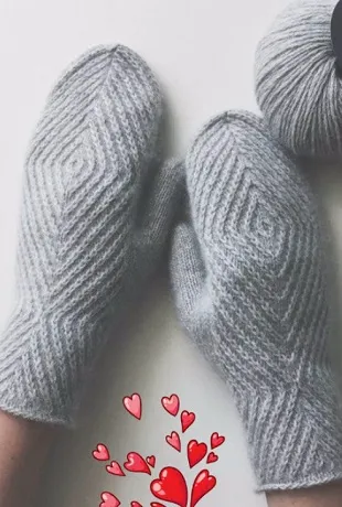 Узор состоит из параллельных линий, связанных лицевыми петлями на изнаночной глади, которые то сходятся, то расходятся относительно центра варежек с лицевой стороны.