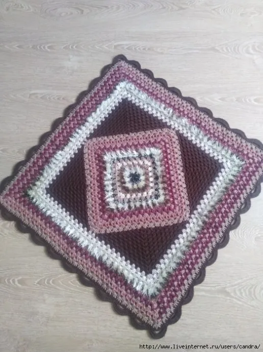 Люблю надвязывать поверх вязания,при этом создаётся орнамент.Фактура полотна становится своеобразной и объёмной.Коврик размером 80х80. Связано крючком №2,5.