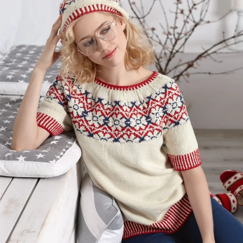 Пряжа (77% хлопка, 15% кашмирской шерсти, 8% полиамида; 175 м/ 50 г) — 250 г белой, по 50 г розовой, синей и красной; спицы №4 и 4,5; круговые спицы №4, 4,5 и 5 длиной 60 и 80 см.