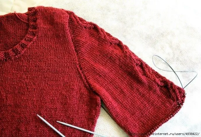 Суть – петли набираются по кругу, вдоль всей проймы, верх рукава, то есть его окат, вяжется при помощи укороченных рядов, постепенно включая все набранные ранее петли, далее вязание опять соединяется в круг, и рукав вяжется сверху вниз по кругу, до самого конца. Плюсы – нет швов, удобно примерять, ваш рукав идеально впишется в пройму, если вдруг после стирки длина рукава вас расстроит, то вы можете спокойно его надвязать или распустить. А, ну и если во время вязания вдруг не хватит ниток, то вы всегда сможете остановиться и потом всех уверять, что такая длина и планировалась Разумеется, вы можете сделать такой рукав и в обычной модели со швами, вязать его после соединения плечевых и боковых швов. Можете так же не замыкать потом работу в круг, если вы это не любите, а продолжить вязать рукав до низу прямыми и обратными рядами, а затем сшить его, без проблем.
