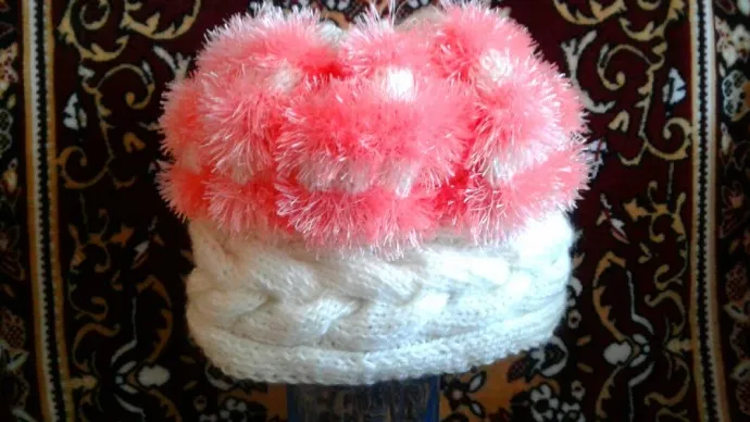 Шапочка вяжется из акрила,отделана пряжей "Травка".Сначала связать ободок с косой.Для этого набрать 24 петли и вязать рисунком "Косы"до нужной длины (объем головы),разделяя 2 изнаночными.Сшить концы.Набрать петли и вязать 12 см. лицевыми (4 ряда),чередуя с пряжей "Травка (4 ряда). Затем равномерно убавлять макушку. Закрепить.Шапочка готова. Для объема, можно проложить скрученную жгутом ткань по всей длине косы.