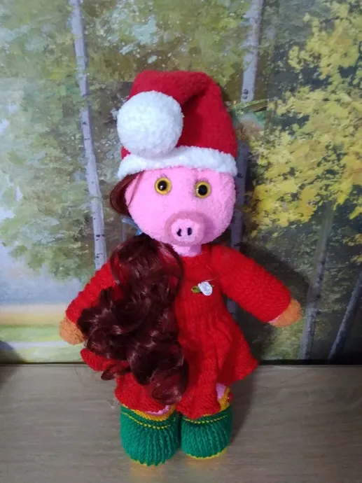 Заказала внученька свинку, но необычную. Поставила условие: с волосами, в красном платье и в колпаке Деда Мороза. Четыре дня с мужем трудились, но к празднику успели