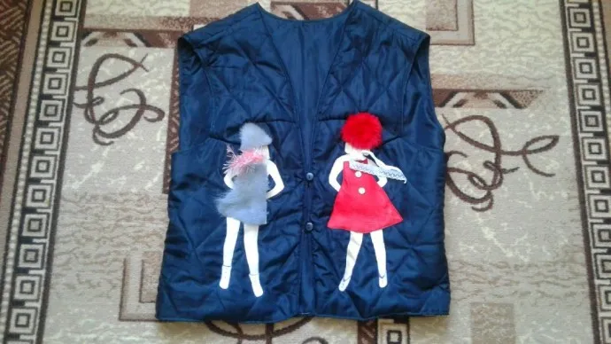 Чтобы украсить какую-то детскую или мрачную вещь, как в данном случае,можно сделать аппликацию.Это может быть и цветок, и листок, домик мечты или зверушка.На своей жилетке я вырезала из кожи силуэт девушек, а затем одела их в шубку и плащик, завязала им шарфики.И получилась дизайнерская вещь. Аппликацию можно и связать из разных ниток.