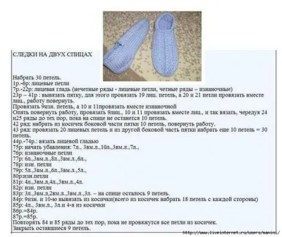 Тапочки вяжутся на двух спицах, начиная с подошвы. Тапочки связаны спицами №4. Размер тапочки 23 см. по длине. Плотность вязания: 20 петель на 20 рядов - образец 10*10 см. Подошва: Набрать 26 петель...