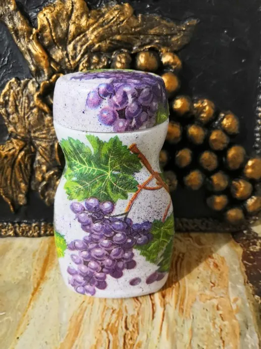Катя, вы опять удивили.ваши дивные баночки мня заворожили, будете усовершенствовать точечную роспись, делитесь своим опытом, мне очень нравится этот вид рукоделия.тоже хочу попробовать может получится что — нибудь, сохранила несколько рисунков точечной росписи, лежат до лучших времен.Виноградная баночка шикарная.
