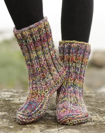 Домашние носочки тапочки спицами для женщин, выполненные вязанием резинкой + платочным узором. Для вязания необходимо сложить вместе несколько тонких нитей разных цветов. Сначала вяжется голенище носка, потом формируется верхняя часть и далее выполняется подошва. Описание рассчитано для нескольких размеров.
