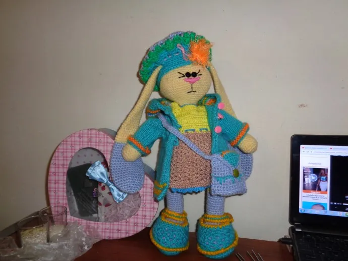 зайка связана крючком, одежда спицами, все снимается, стоит самостоятельно, наполнитель халофайбер