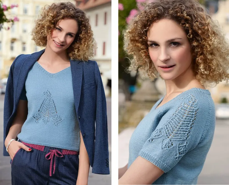 Красивый фантазийный узор, украшающий рукава и перед этого пуловера, смотрится невероятно стильно и нежно на фоне лицевой глади.