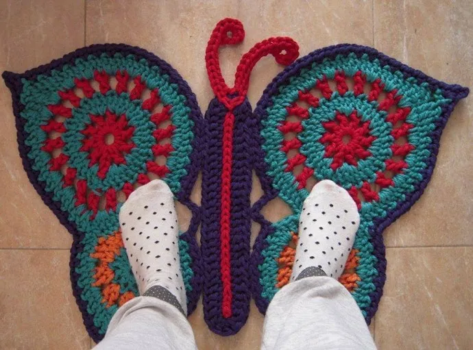 Оригинальные коврики крючком в ванной комнате или прихожей всегда оживляют интерьер и радуют глаз. Бабочка довольно простой в вязании коврик крючком из отдельных мотивов впоследствии обвязанных вместе.