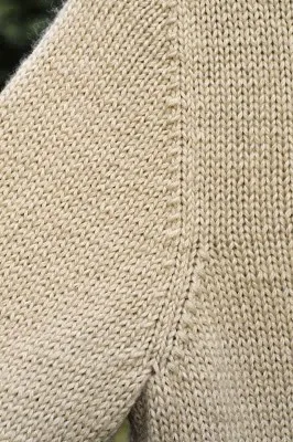 Пройма (спинка). В начале следующих двух рядов закрываем по 6 п. (столько же, сколько и на рукаве), Дальше убавления делаются в лицевом ряду. Делаем убавления следующим способом: начинаем с кромочной петли (снимаем не вывязывая н начале каждого лицевого или изнаночного ряда), 1 лиц., 2 вместе на право, вяжем до последних 4 п., 2 вместе на лево, 1 лиц., 1 кромочная. Это делается в каждом 2-ом ряду 7 раз, в каждом, 4-ом ряду 4 раза. Вяжем до желаемой высоты (не забывая про возможное растяжение при стирке), закрываем оставшиеся петли плеча по описанию или выкройке. Повторяем аналогично для переда.
