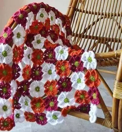 Ну вот не люблю я эти неточности: цветочки то в пледе на 4 лепестка, а схема на 5! И соединение идет не серединами лепестков, а их углами, и лепестки получаются не круглые, а с прямыми углами