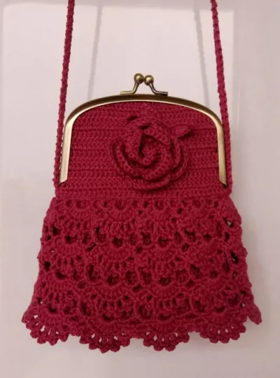 Сумочка на фермуаре винного цвета. Украшена кружевной оборкой и розой с лепестками. Связана из хлопковой пряжи. Высота сумочки 18 см, ширина 15 см. Длина вязаной цепочки 100 см.