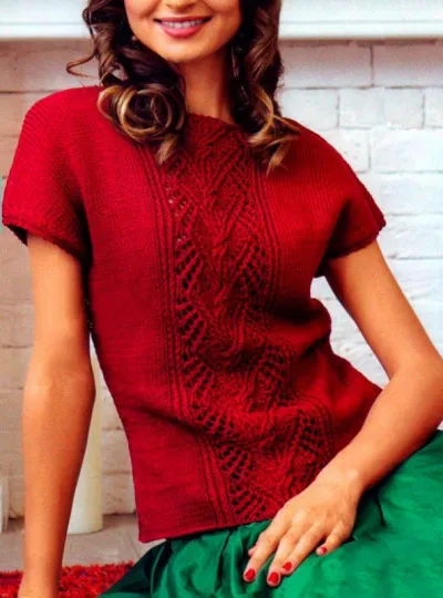 Петли распределить следующим образом: 1 кром. п., 27 п. – лиц. гладь, 35 п. – центральный узор, 27 п. – лиц. гладь, 1 кром. п. и вязать согласно схеме центрального узора. Для оформления линий боков в 7-м ряду от наборного края закрыть с обеих сторон по 1 п., затем в каждом 8-м ряду 3 раза по 1 п. На спицах = 83 п. Далее в 39-м ряду от наборного края выполнить прибавки с обеих сторон по 1 п., затем в каждом 8-м ряду 5 раз по 1 п. На спицах = 95 п. Для оформления линий пройм в 82-м р. от наборного края выполнить прибавки с обеих сторон по 1 п., затем в каждом 4-м ряду 12 раз по 1 п. На спицах = 121 п. Для оформления линий плеч в 134-м ряду от наборного края закрыть с обеих сторон по 3 п., затем в каждом 2-м ряду 1 раз по 3 п.,