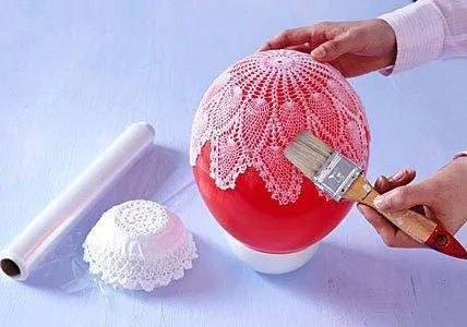 Готовую салфетку стирают и крахмалят , после чего накалывают на белую плотную бумагу , на которую предварительно нанесен