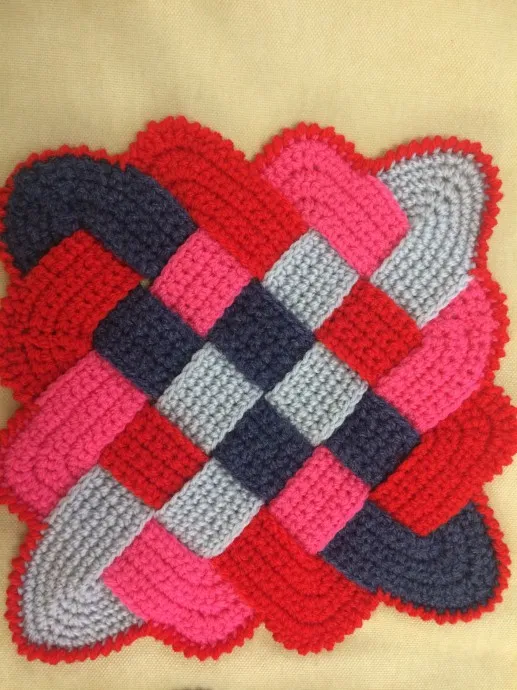 Набрать 72 возд.петли. Замкнуть в кольцо. для удобства сразу середину обозначить булавкой.В каждую петли провязать 1 ст.без накида. исключение составляет край овала.Дойдя до булавки провязать по 2 ст.без накида в петлю перед булавкой, над булавкой и после булавки. Провязать 6 рядов. на закруглении 3 прибавки . цепочку второго овала не замыкать. Овал связать разъемный. Прямоугольники вязать так же разъемными.в начале и в конце каждой стороны вязать по 2 ст. без накида, в остальные петли по 1 ст. без накида. В каждом ряду на закруглении делать 2 прибавки.Связать 6 рядов. Приступить к сборке .Овалы распределить крест на крест, потом выложить прямоугольники. переплетать в шахматном порядке. Далее оба прямоугольника и овал сшить. Расправить все плетенки. Обвязать край одним рядом ст. без накида или рачьим шагом. на углу сделать петельку ( 8 воз.п).