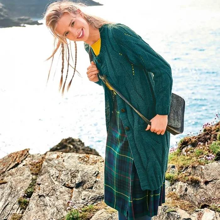 Удлиненный кардиган связан от начала и до конца равномерным пластичным узором, имеет вместительные карманы и застегивается на крупные пуговицы, как у пальто.