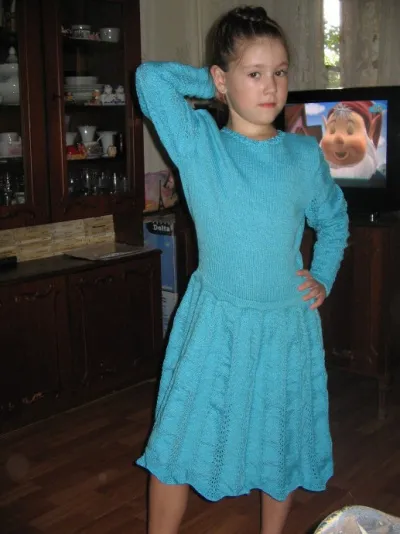 Это платье связано на заказ для подруги. Связано спицами, перед и спинка - лицевой гладью, рукава и юбка - узор "волны". На фото в роли модели моя племянница, платье ей великовато. Фото платья на хозяйке, к сожалению, нет. Моя подруга миниатюрная, худенькая.