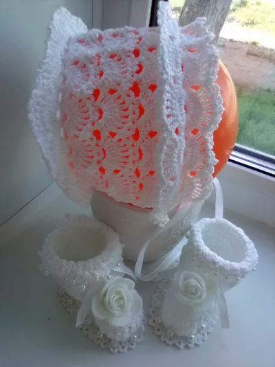 Чепчики связаны крючком из ниток хб в разной цветовой гамме. Пинетки связаны также крючком и украшены бусинками и розочками из фоамирана.