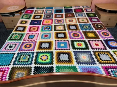 Здравствуйте, дорогие рукодельницы. Я довольно долгое время не заходила на свою страничку и меня даже потеряли. Причин несколько, первая из которых моя работа, потом сын сломал ногу, следом подхватил ветрянку, поэтому времени для посещения интернета у меня совсем не было. Правда по дороге на работу и с работы (пока в поезде еду) мне удалось закончить свой долговяз, который я начала вязать еще в прошлом году. Связала ровно половину и забросила. И только в конце января текущего года я продолжила. Вчера я закончила работу и делюсь с вами результатом. 81 мотив, размер евро, вес не знаю, на весах батарейка села. Использовала остатки разной пряжи, получилось ярко, да и мешок с остатками пряжи уменьшился. Думаю схемой делиться не стоит, это обычный БК.