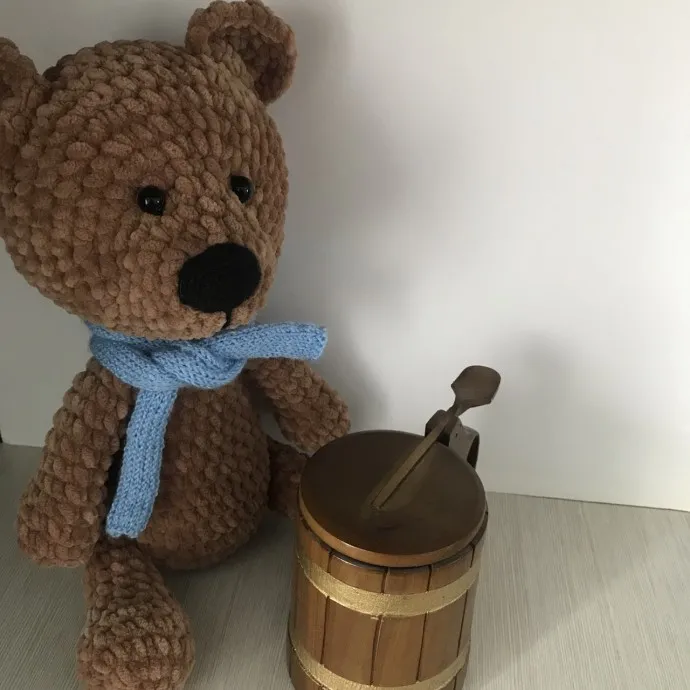 Решила связать из велюровой пряжи. Получился такой мишка.