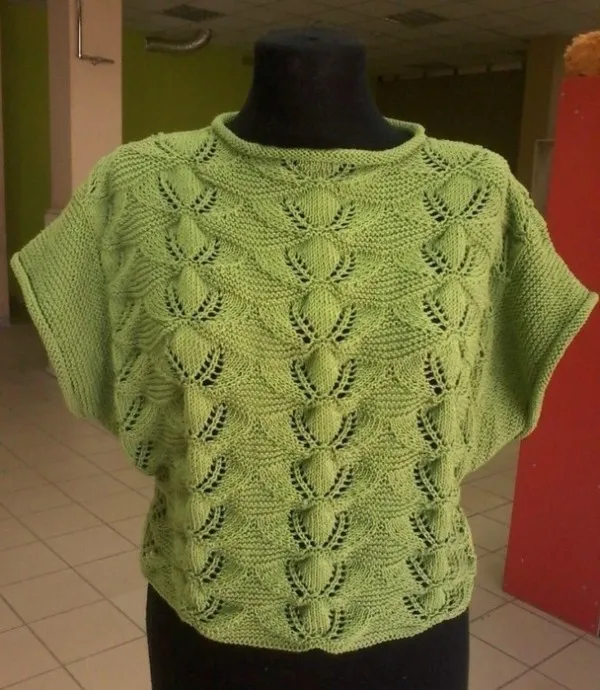 пуловер с очень красивым узором вяжется по прямой, а рукава надвязываются по готовому изделию платочной вязкой.