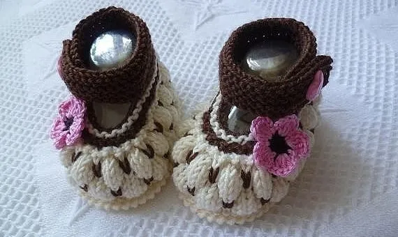 оформляем верх сапожка для этого берем зеленую нить. 57 ряд — 1 лицевая зеленая, 1 лицевая с протяжками зеленая, 1 лицевая зеленая. 1 лицевая розовая, 1 лицевая зеленая, 1 лицевая с протяжками зеленая, 1 лицевая зеленая, 1 лицевая розовая и т.д. Розовую нить обрываем подлиннее. теперь вяжем только зеленой. 58 ряд — изнаночные петли. 59 ряд — 3 лицевых, 1 изнаночная , 3 лицевых, 1 изнаночная и т.д. . 60-61-62 ряды — по рисунку. 63 ряд — закрыть все петли. Сшиваем все детали сапожек и обвязываем крючком по верхней бороздке подошвы. Украшаем цветочками и бубонами.