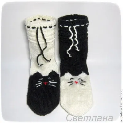 Второй носок вяжем аналогично первому, меняя местами цвета — белым начинаем, черным продолжаем и заканчиваем.