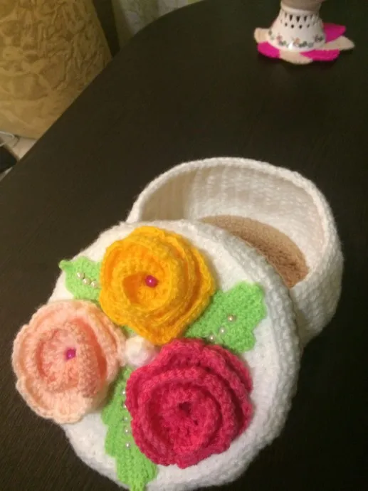 В корзинка с цветами связана крючком из кавказской пряжи