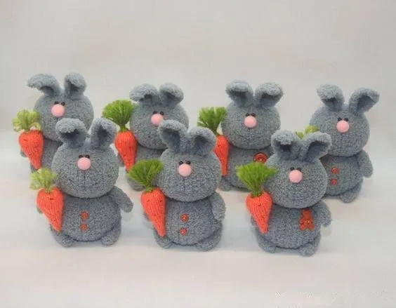 А я вязала похожих заек из гладкой пряжи(из акрила), только у моих ушки подлиннее и они у меня в свитерочках