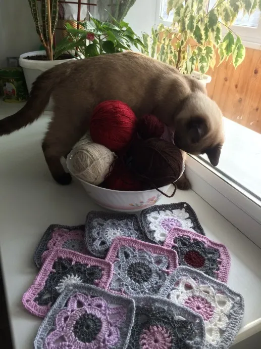 Как-то получилось все само собой. Специально не подбирала нитки. Вот что было, то и пустила в ход. Правда, еще есть одна задумка с бабушкиным квадратом, но уже в бирюзово-серо-голубом тоне. Не знаю как получится, но надеюсь.