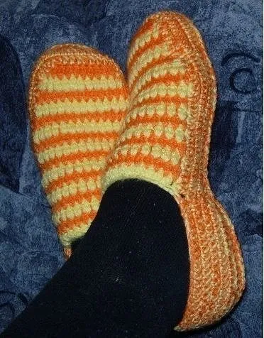 Теперь вяжем переднюю часть тапочка. Узор - пышные столбики. Для этого связала цепочку из 17 воздушных петель. В первом ряду в каждую воздушную петлю вяжем по 2 столбика с накидом и заканчиваем их одной петлей (то есть накид, втаскиваем петлю,провязываем вместе накид и вытащенную петлю, опять накид,опять вытаскиваем петлю, опять провязываем вытащенную петлю и накид, а затем провязываем вместе 3 петли на крючке). След.ряд - ниткой другого цвета, и столбики вяжем между столбиками предыдущего ряда,чтобы получился "шахматный" рисунок. Для того,чтобы ряды не сужались - в начале ряда вяжем 3 воздушные петли подъема, а в конце - 1 столбик с накидом. Должно получиться 10 рядов, то есть 5 одного цвета и 5 другого. Затем по краям сужаем, то есть в каждом ряду сначала и в конце не вяжем петли подъема и заключительный столбик, а сразу вяжем пышные столбики между столбиками предыдущего ряда. На нужной высоте, когда останется примерно 8 или 9 столбиков, закрыла вязание и нитку оборвала.