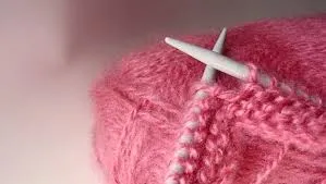 Когда вязание стало нужной ширины, в конце ряда я перестала делать прибавления, и, наоборот, стала убавлять петли, провязывая по 2 вместе лицевой с наклоном влево в каждом лицевом ряду. Так получаются диагональные полосы.
