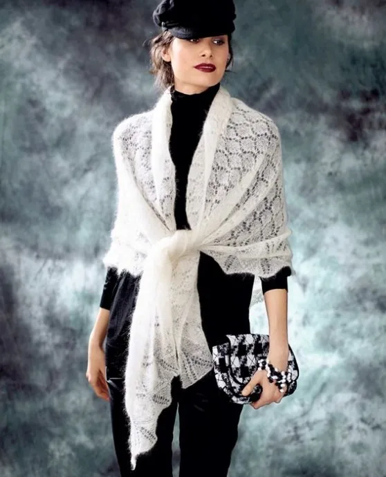 Невеcoмая и теплая ажурная шаль украшена ввязаными cеребриcтыми буcинами.