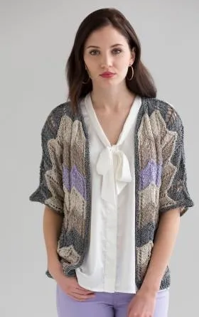Свободный кардиган спицами для женщин, выполненный из смесовой летней пряжи средней толщины. Вязание модели осуществляется узором шевроны, раппорт которого составляет 12 рядов. При этом в работе используется несколько цветов пряжи. Кардиган имеет цельнокроеный рукав. Описание рассчитано для нескольких размеров.