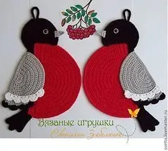 Хочется отметить, что все эти прихватки состоят из простых элементов. К примеру, прихватка с колокольчиками вяжется как круг из столбиков с накидами, по кругу оформляется объемным узором. Отдельно вывязываются колокольчики, убавляя петли по мере рядов для достижения нужной формы. Уже готовые колокольчики пришиваются к прихватке.