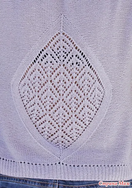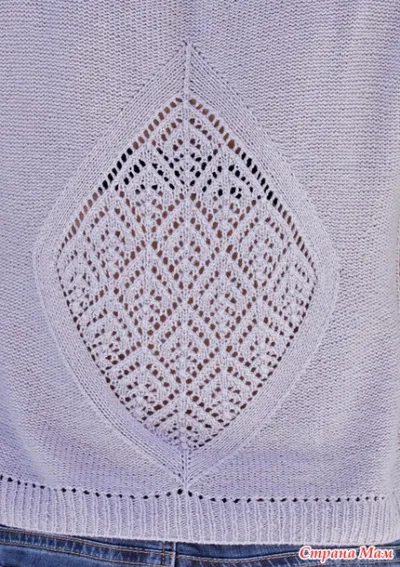 Ниточка протянутая посредине, это скорее всего, снятые накида. Узор, как вы пишите «ромб большой» — ажур обрамлён лицевой гладью на фоне платочной вязки. То есть вяжем (если я правильно посчитала 5 петель лицевыми, которые (если смотреть снизу сдвигаются в стороны на 1 петлю (как бы расширяются), а потом уменьшаются на 1 петлю в центр. Косичка в лицевой глади — это способ вывязывания V образной горловины www.youtube.com/watch?v=hIj7dbK1q6U&t=12s Посмотрев это видео может вам станет более понятным.