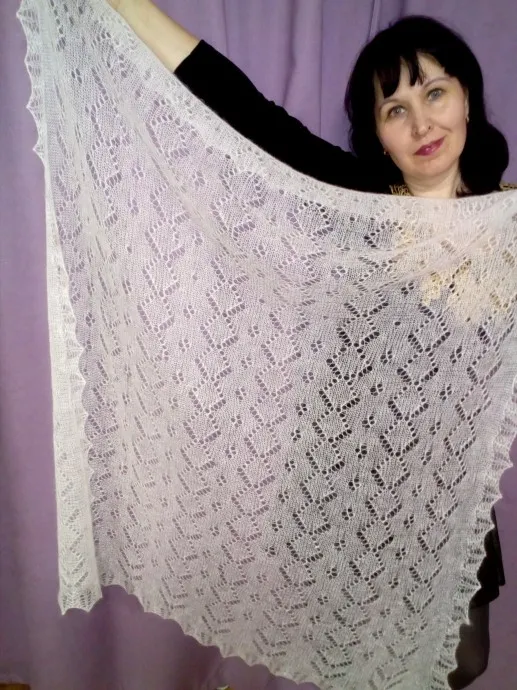 Добрый вечер !!! Хочу показать какая шаль у меня получилась. Мне заказали белую квадратную шаль.и времени дали 2 недели....и ...я решила связать на машине и после обвязать кайму уже на спицах....Очень долго пришлось потрудиться...наработать своих секретиков ...даже чуть не плакала....нитка тонкая и пушистая ,с машины слетает , зацепляется....НО я смогла ....и сама довольна своим результатом....размер 120 на 120 см.вес 88 гр ..нитка АЛИЗЕ кид мохер роял