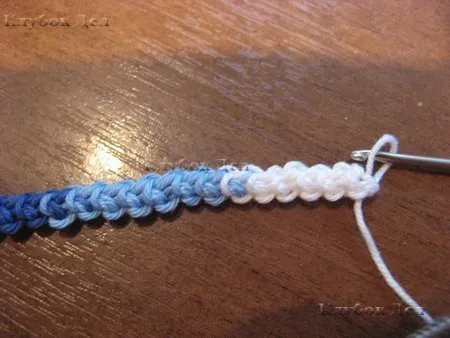 8. Введите крючок лод две нити на боку (кромке) провязанной детали и повторите вышеописанные операции.