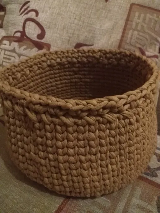 Я вяжу для себя. Если честно то вязание мне помогает расслабиться. Но я давно не вязала. Недавно я попала на этот сайт и зарегестрировалась, тк как увидела для себя много интересного. Решила опять взять в руки спицы и крючок. Начала сразу несколько проектов. В том числе и решила попробовать связать корзинку из трикотажной пряжи. Купила 1 моток и моя первая корзина была довязана вчера. Не все моменты мне нравятся. Ошибки есть, но вы целом мне понравилось и мне нетерпется еще несколько корзиночек связать. Я в нее сразу поместила свои рабочие материалы.