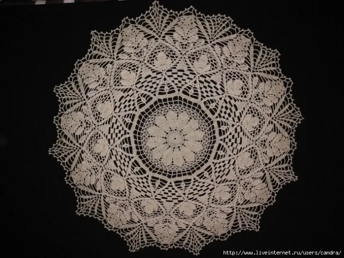 Связала очередную салфеточку,меняя при этом пряжу и номера крючков.Розетку(сердцевину)связала крючком №1,10,затем вязала №1,15,затем №1,25.Завершила салфеточку крючком№1,5.Диаметр салфетки 68см.