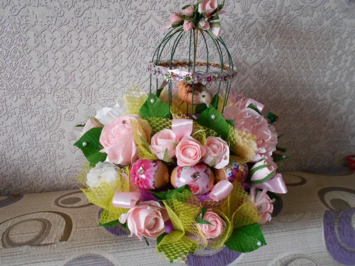 Букет из конфет «Светлая Пасха» – плод моей фантазии. Ангелочка из картона (в нём коробочка для яйца) нашла на просторах интернета, добавила бусинки, фатин, стразы – получилось нарядно и празднично. Успехов всем вам!