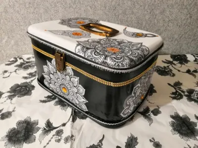 какой милый чемоданчик, эффектный такой декупаж или как это правильные назвать
