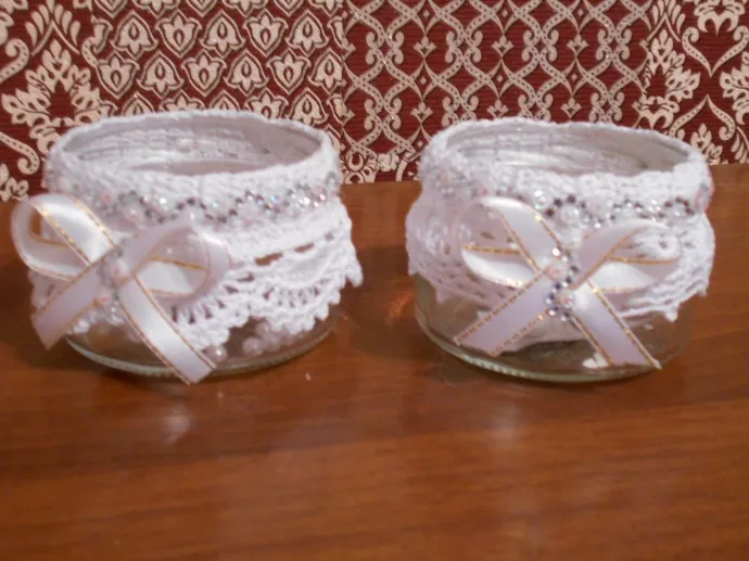 Внесла последний штрих к встрече Пасхи. Вот такое украшение будет на Пасхальном столе - подсвечники. Баночки украсила тесьмой, связанной крючком, атласной лентой, стразами, внутри разместила бусинки жемчужные и свечи. Для красных свечей связала подсвечник цветочным мотивом, приклеила красные стразы.