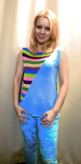 Вот такие маечки я вязала на лето.Машина нева-2.Частичное вязание.Единственное.что не понравилось.косит очень в вязании.
