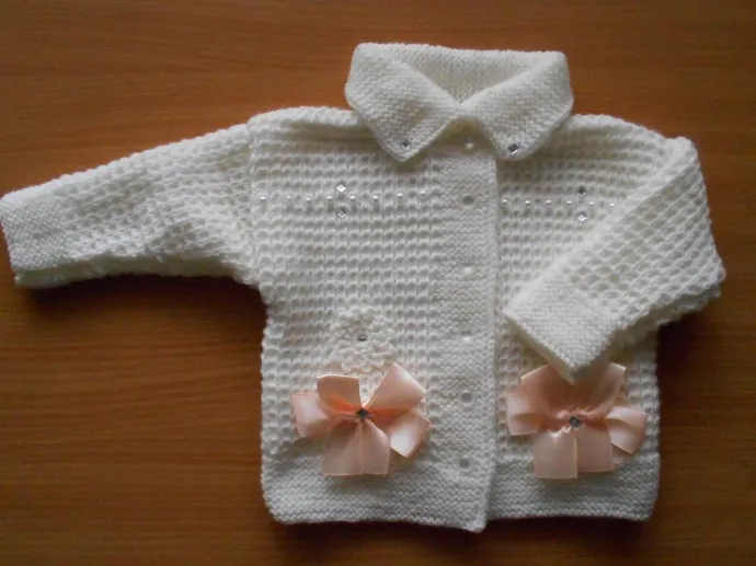 Манжеты и воротничок, бортики пинеток и отворот шапочки вязала платочной вязкой. Цветочки связала крючком. Шапочку и кофточку украсила стразами и жемчужными бусинками. Сделала бантики из атласной ленты, прикрепила с помощью клеевого пистолета. При стирке не отклеиваются, уже проверено.