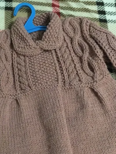 Увидела модели с бусинами и так загорелось попробовать.Сарафанчик связан из полушерсти.Бусины ввязывались в процессе работы.Вот такой наряд получился для маленькой принцессы.