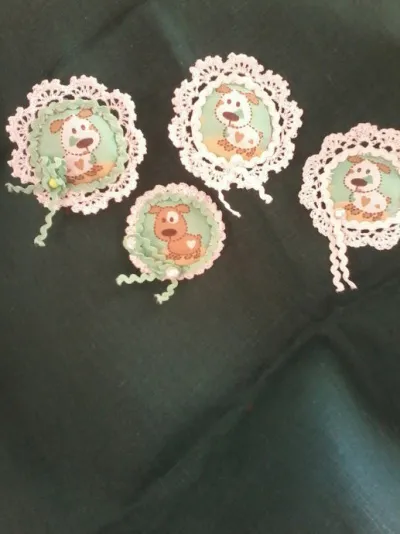 Из ткани вырезала кружочки с изображением собачки, обвязала два кружка крючком, наполнила фабертеком, обвязала кружевом.