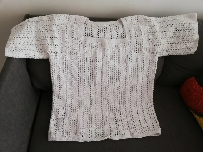 Добрый вечер! Связалась летняя кофточка из тонкого итальянского хлопка размер 48-50 весит 120гр, вот только что то лето обходит нас стороной, сегодня выпал снег сантиметров 10
