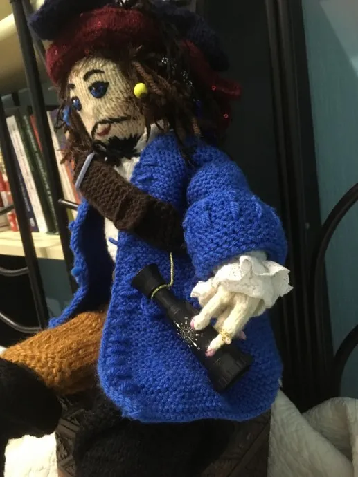 Вязанная из шерсти спицами кукла.Пират Джек -воробей украсит ваш интерьер, подарок для любого возраста.